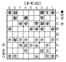 参考2図は▲8八飛△7七角成▲8二飛成△6七馬で銀が取られますが、先手も▲6二竜と銀を取り返せるので、2枚飛車が強力な先手良しです。▲8八飛には△8五歩で一局の将棋です。